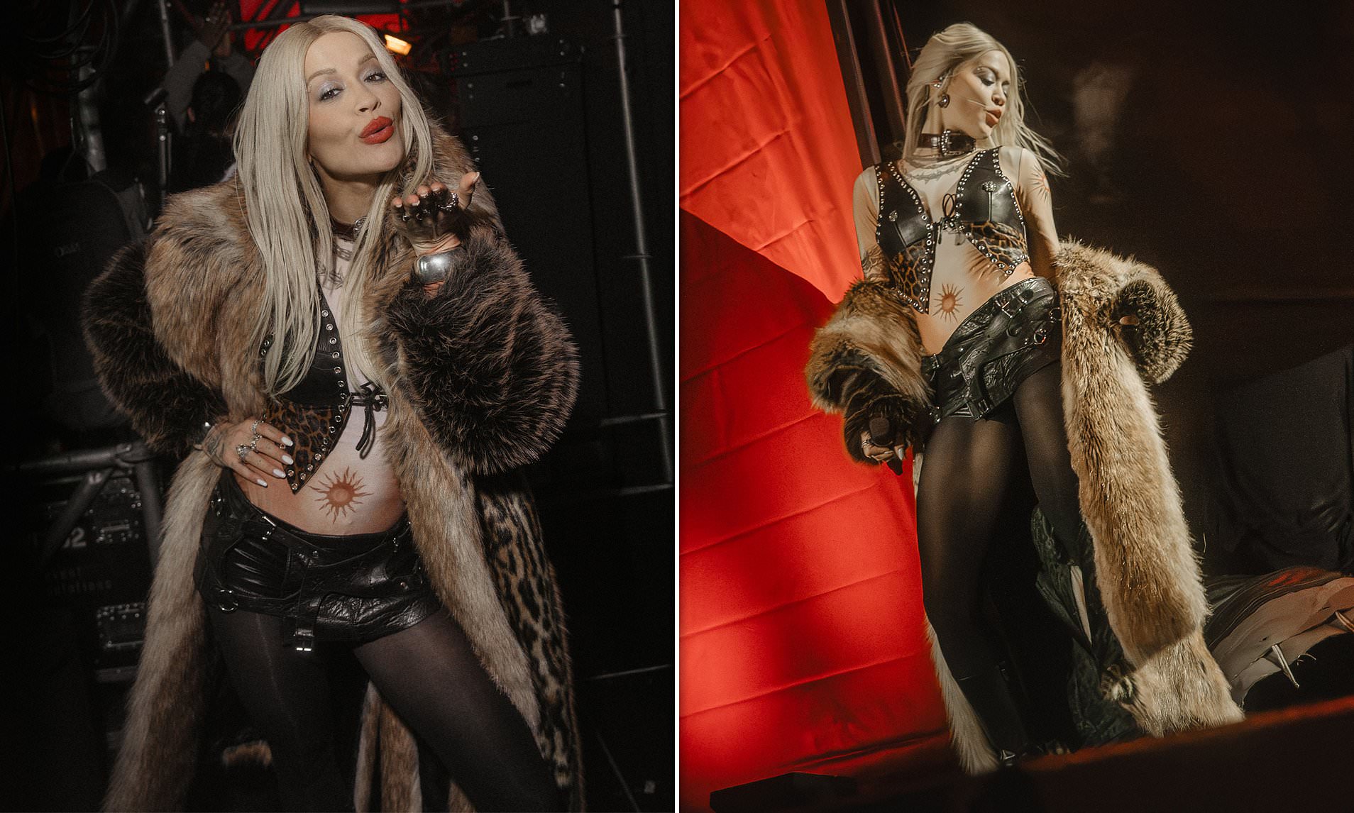 Adding a few layers to her daring display, the I Will Never Let You Down hitmaker sported a luxurious faux fur coat, worn open to showcase her taut abs and a fake sun tattoo, as well as a pair of black tights.