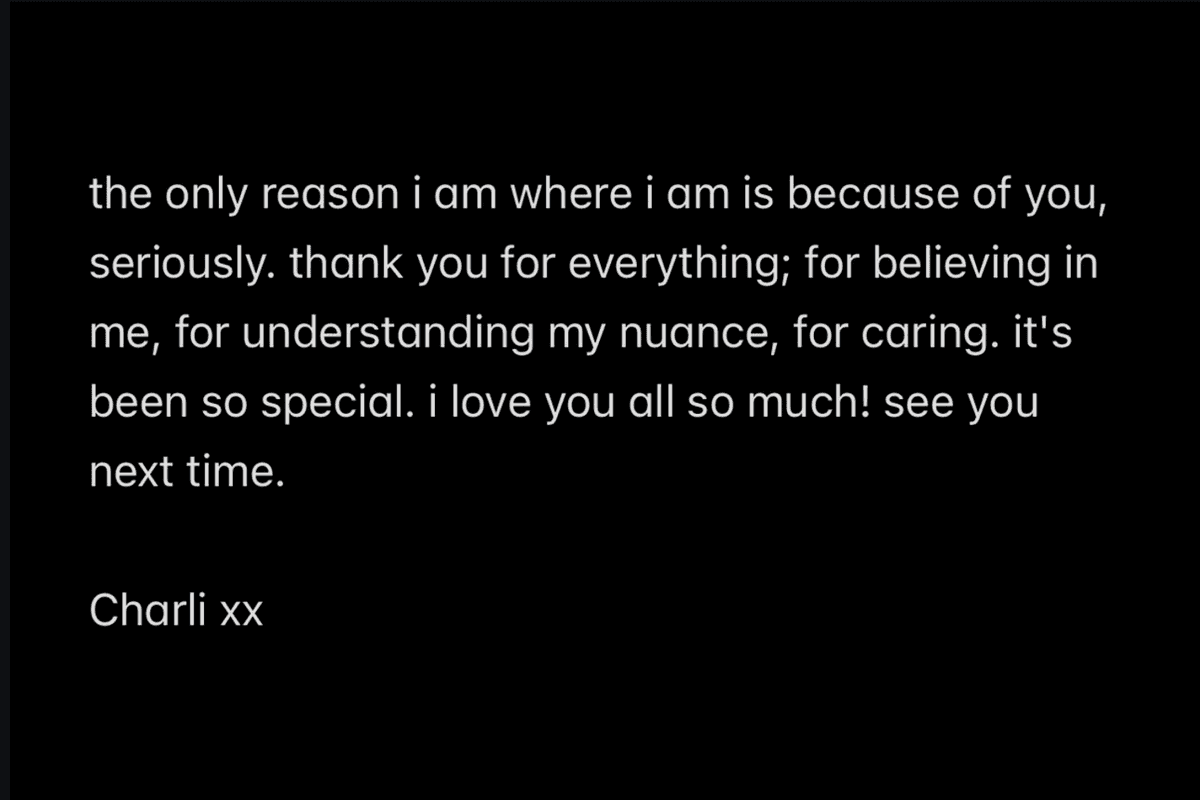 "The only reason I am where I am is because of you, seriously," she wrote. "Thank you for everything; thank you for believing in me, for understanding my nuance, for caring. It's been so special. I love you all so much! See you next time," and signed off the message "Charli xx."